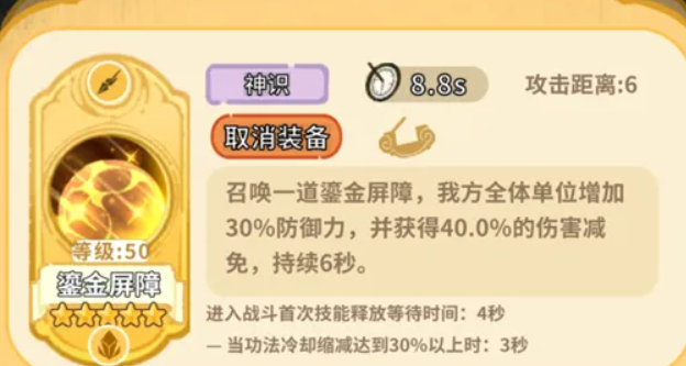 另一关键技能“鎏金屏障”,可展开持续6秒的全域防护结界,使我方全体单位获得30%防御力提升及40%伤害减免。该机制大幅强化队伍容错率,配合控制链可有效打乱敌方节奏,创造输出窗口。