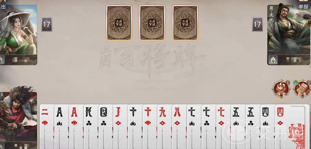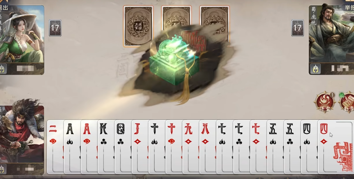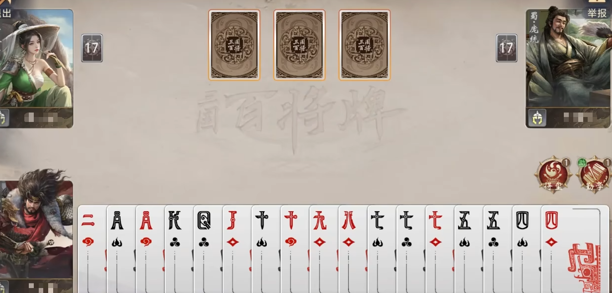 技能机制详解:“得玺”的触发条件为——当前手牌中不含三张K或K炸弹时,立即获得3张K。这意味着只要未提前凑齐K系炸弹,该效果每局必发动一次,稳定补足关键组件。需注意:若开局已持有至少一张K,则不触发;但即便如此,仍可通过后续出牌策略引导至触发窗口。