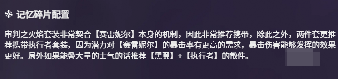 记忆碎片配置直接影响其输出效率。首选推荐“审判的火焰”,该碎片与赛雷尼尔的暴击流路线高度契合,能同步提升暴击率与暴击伤害,实现伤害倍率跃升。次选“执行者”,虽暴击率增幅略低于前者,但可增强暴击触发的稳定性,降低输出波动性。二者组合使用,可在覆盖率与伤害倍率两个维度形成互补,规避单一属性堆叠导致的收益衰减问题,从而夯实其C位输出地位。