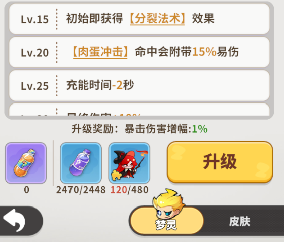 天赋成长线进一步强化其火系专精定位。初始解锁天赋“分裂法术”,使所有法术伤害具备分裂特性,显著扩大清场半径;20级激活“肉蛋冲击”,命中目标后附加15%易伤效果,有效提升全队整体输出效率;25级开放“充能时间减少2秒”,大幅缩短技能循环间隔,实现火锅投放密度与灼烧覆盖率的双重跃升;每次升级同步提升暴击伤害,确保成长曲线稳定且具备明确数值反馈。