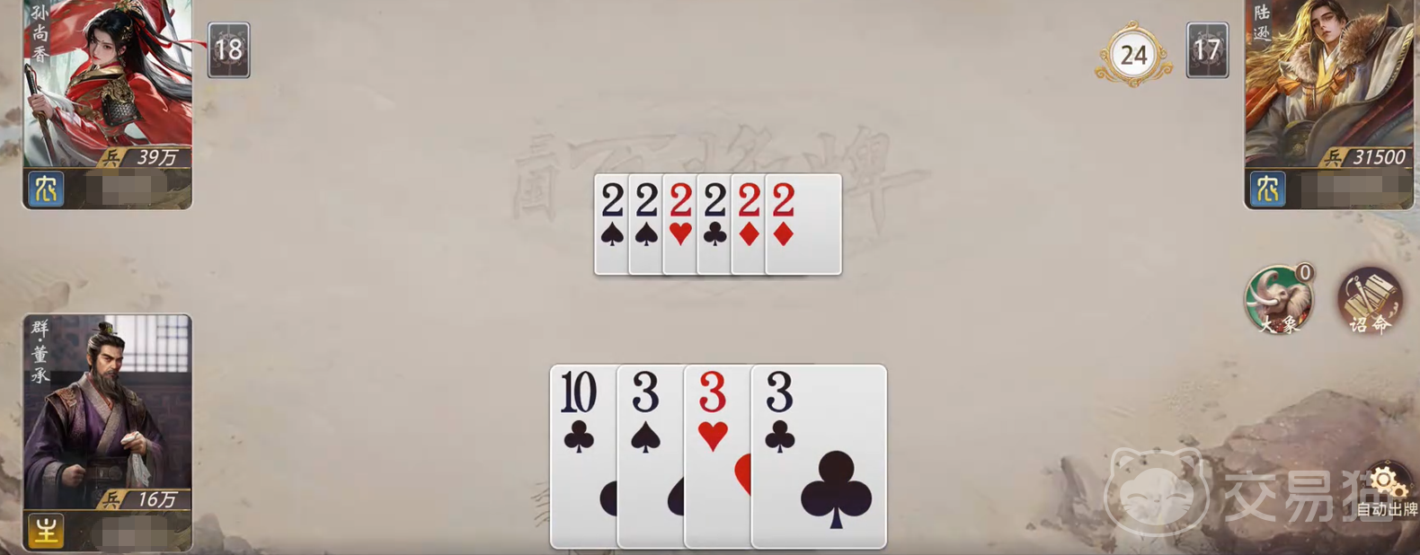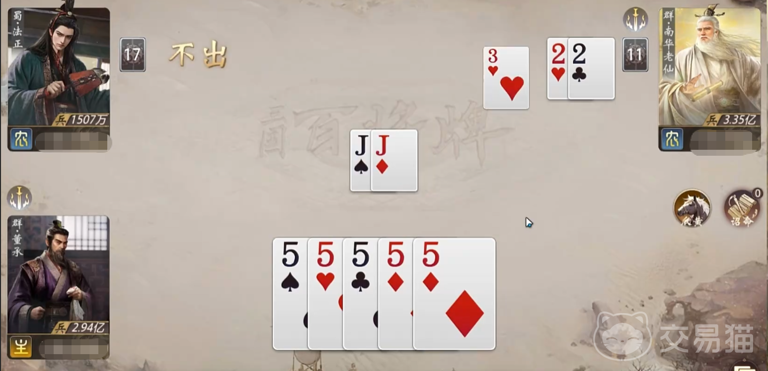 对敌方而言,应对董承的关键在于【王】的压制管理。若未能在董承打出【王】的当回合完成有效压制,则其后续所有单牌均按规则升至点数2,实际等效于手牌质量整体跃升。因此,观察其手牌构成变化、预估剩余单牌数量及分布密度,是制定反制策略的基础。尤其在中后期,需优先保留具备压制能力的牌型,避免因低估诏命增益而陷入被动清台风险。