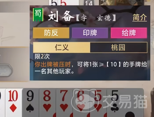 需特别注意技能限制条件:“仁义”不可传递点数超过10的牌,且每局仅有两次使用机会。此外,其被动技能“桃园”为条件触发式效果——仅在“仁义”两次全部使用完毕后的首个回合生效,且要求当前手牌中非废王牌数量恰好为3张。该机制赋予刘备持续作战能力:补牌后可快速重构支援资源,避免中后期陷入支援真空期,从而保障团队全程战术执行的稳定性。