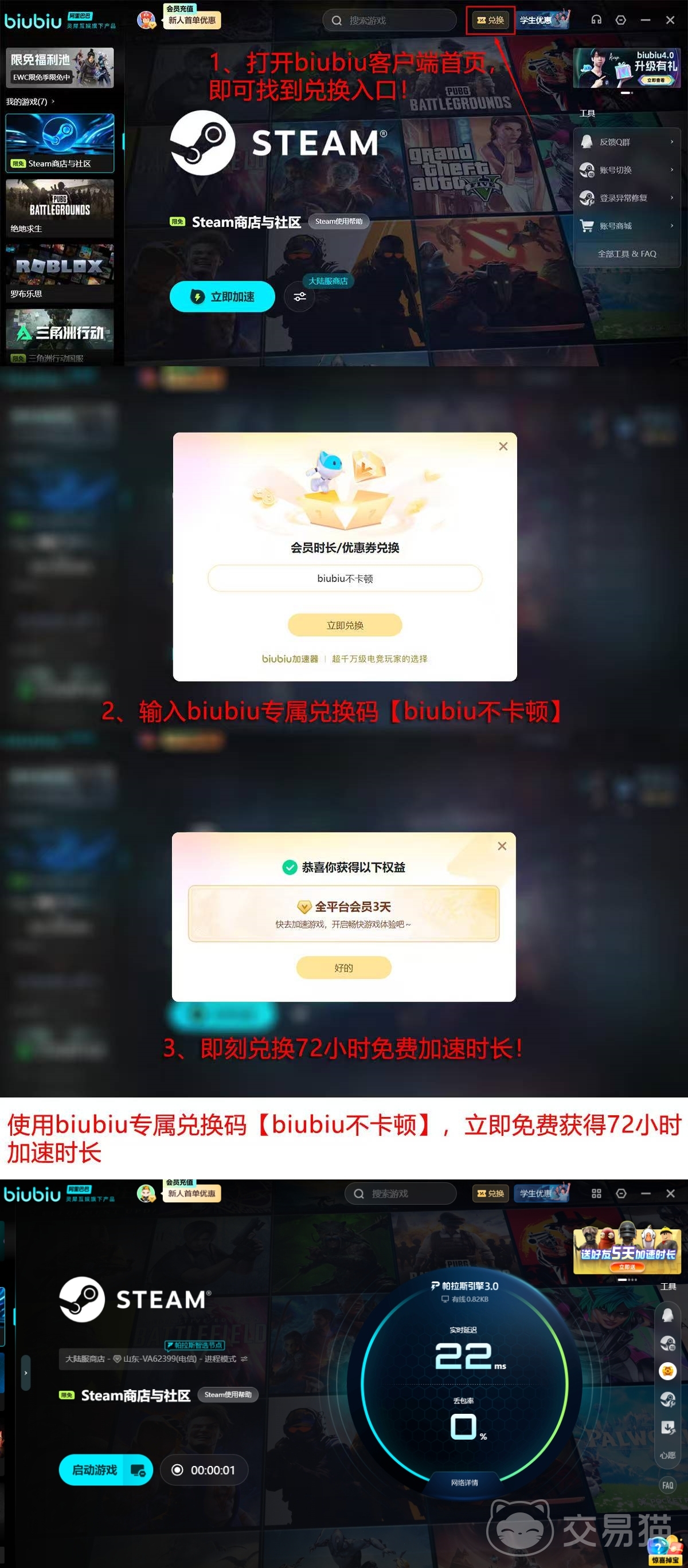 该工具亦被职业电竞选手选用——例如PUBG项目明星选手xdd,其日常训练对网络响应精度要求严苛,侧面印证了该方案在实时性与稳定性方面的可靠性。此外,新用户注册可获24小时免费试用时长;通过【biubiu不卡顿】兑换码还可额外激活3天高级服务权限,降低初次使用门槛。
