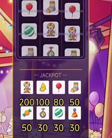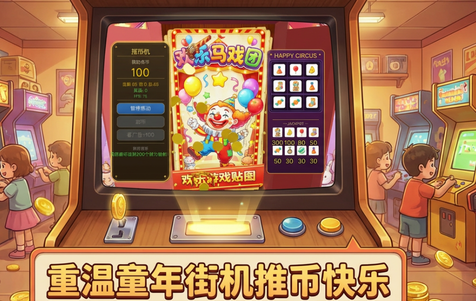 游戏启动后首屏呈现一台风格鲜明的小丑主题推币机,机身醒目印有“欢乐马戏团”五字标识,整体美术采用高饱和度配色与圆润线条设计,兼顾辨识度与亲和力。设备建模细节丰富,包括金属质感旋钮、动态闪烁灯带以及可交互式投币口,进一步强化场景真实感。