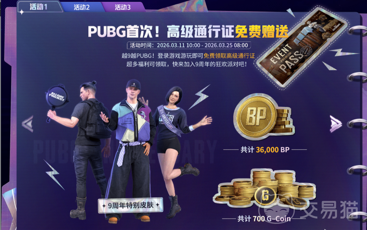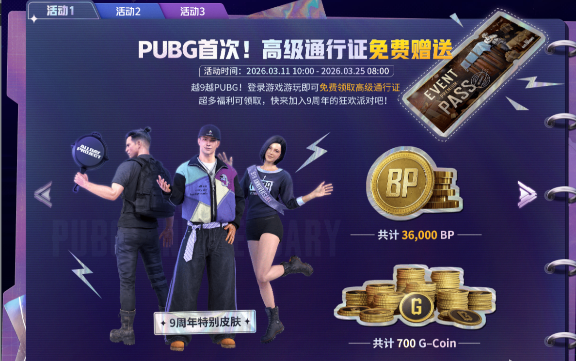 此外,《绝地求生》首次向全体玩家发放高级通行证权益:活动期间(3月11日10:00至3月25日08:00),仅需完成一次对局即可免费领取,包含总计36000BP与700G币。