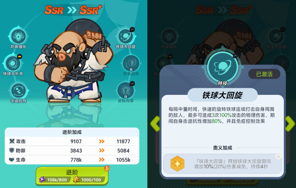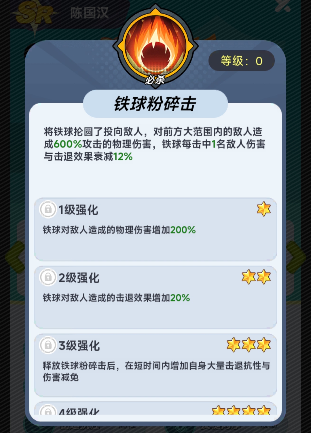 陈国汉的战斗定位明确为前排承伤型坦克,基础属性侧重高生命值与物理减伤。除稳定吸收大量伤害外,其主动技能具备中等范围群体打击效果;随角色等级提升及星级进阶,可逐步解锁“抗击退”机制——该效果能有效抑制敌方位移类控制与强制击退技能,显著增强阵型稳定性,并为后排输出创造更安全的持续输出环境。