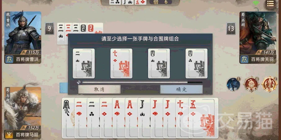 实战层面,马超的压制效能随对手出牌量递增而增强。“合围”的信息优势需建立在足够多的已出牌样本之上,因此开局宜采用低点数对子或顺子试探,诱导敌方提前消耗手牌资源,同时保留高点数对子、三张牌及带牌结构,为中后期组合炸弹预留空间。玩家须实时记忆他人已出牌面,在关键回合精准触发“合围”,以组合炸弹夺回出牌权,实现局势翻转与持续施压。