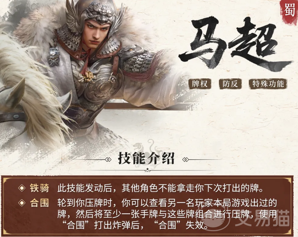 “铁骑”为锁定技,生效时强制固定马超下一轮的出牌顺序,有效抵御关羽、曹操等具备抢牌或顺位干扰能力武将的压制,是保障关键手牌不被截断的核心屏障;“合围”则为限定技,每局最多发动两次,发动后可查看全场已打出的牌,并据此将自身手牌与之组合形成高阶牌型(如炸弹),一旦成功组合炸弹,该技能当局剩余使用次数即归零。二者协同运作,使马超成为兼具防御稳定性与反击爆发力的节奏主导者。