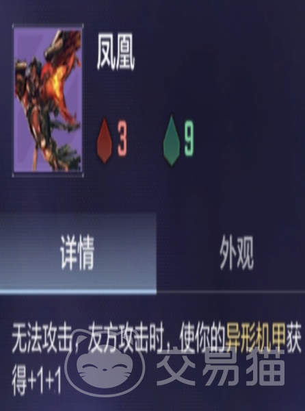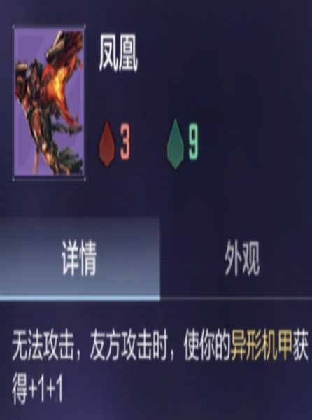 凤凰为非攻击型角色,无法进行主动输出。但每当任意友方单位发动攻击,凤凰即可为所有异形机甲单位附加+1/+1属性。其战术定位为前排承伤单位,在吸收敌方火力的同时持续强化异形机甲战力,功能不可替代。