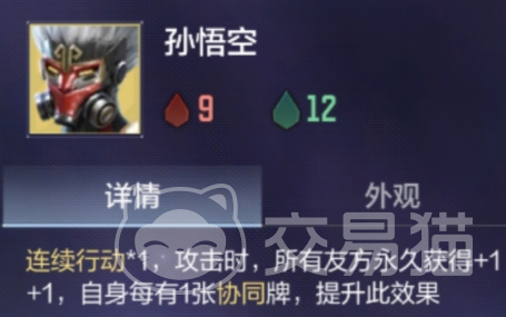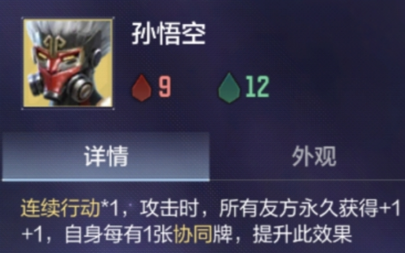 孙悟空拥有连续行动机制,每次攻击均可使全体友方单位永久获得+1/+1属性提升。该效果存在协同牌数量加成:其自身所附着的协同牌越多,单次攻击触发的全队增益幅度越高。因此,孙悟空既是主力输出点,也是全队属性成长的核心引擎。