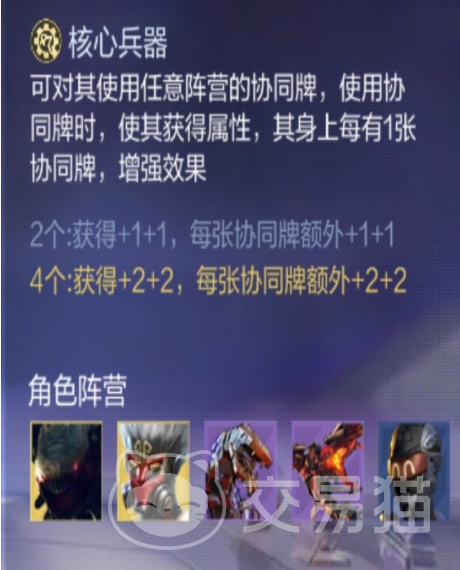 核心兵器阵容的基础机制在于其开放式的协同牌兼容规则——可无门槛使用任意阵容产出的协同牌。每张协同牌均可直接转化为角色属性增益,且增益效果随场上协同牌总数呈阶梯式提升。当己方场上有2张核心兵器角色时,即触发基础+1/+1加成;此后每新增1张协同牌,额外叠加1层对应增幅;若核心兵器角色数量达到4张或以上,全部协同类增益效果将整体翻倍。该机制赋予阵容极强的滚雪球能力,中后期属性成长曲线陡峭。