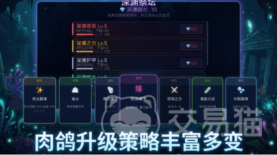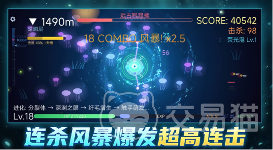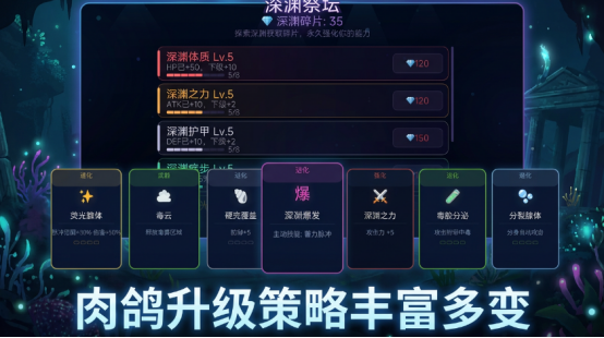 本作摒弃线性成长路径,构建开放式进化树系统:初始阶段仅具备微弱荧光与基础游动能力;随着资源积累与战斗经验提升,可自主选择触手强化路线(侧重爆发控制)、甲壳增生方向(提升防御韧性)或感官异化分支(增强环境感知与预警能力)。每条进化路径不仅改变外观模型与属性权重,更会动态影响敌对生物群落的生成逻辑与行为模式,实现“进化即策略”的深度耦合设计。