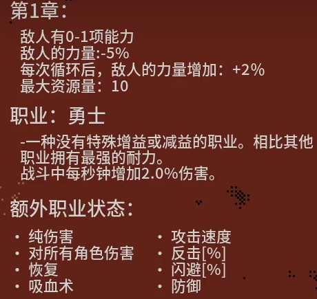 职业系统随进度逐步解锁,不同职业状态提供差异化战斗支持:纯输出型状态侧重提升攻击速度;群体伤害型状态则增强百分比回击率;吸血类能力可转化为持续生命回复,延长角色在高难度循环中的续航时间。由于第一章敌人强度有限且增幅幅度较低,只要合理构建耐力驱动的战斗体系,即可通过力量属性实现稳定压制。