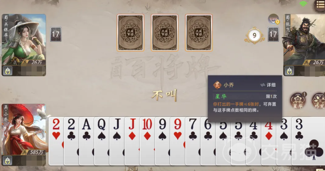 发牌完成后进入叫地主环节,玩家依据初始手牌质量与武将技能联动空间作出判断。成功当选地主者将获得额外三张底牌,进一步拓展出牌选择面;而农民方则需通过信息共享、节奏协同与压制时机把控,形成有效围堵。整个流程严格遵循顺时针出牌顺序,上家出牌后,下家须以同类型且点数更高的牌型压制,否则只能选择跳过。该机制确保对抗连续性,也强化了预判与资源管理的重要性。