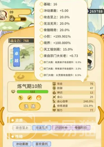 洗练过程中存在一项实用技巧:“修炼速度”资质仅影响打坐效率,实战价值较低。若在洗练中随机出现该词条,建议暂缓替换,待弟子境界达到满阶后再统一处理,避免提前消耗宝贵洗练次数。