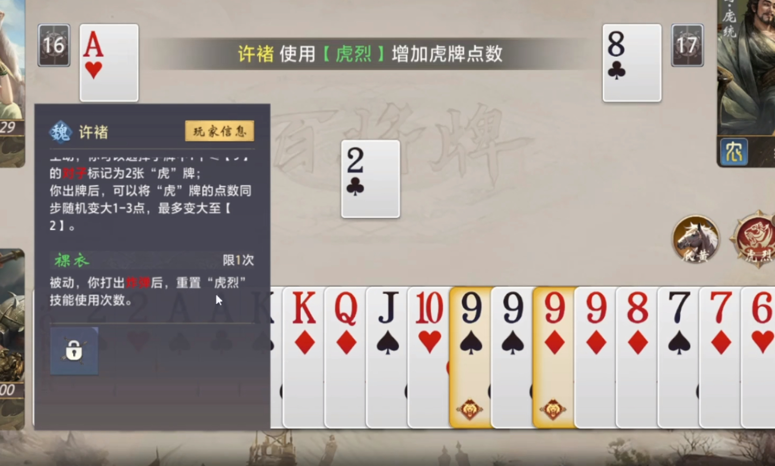 许褚定位为魏国核心输出武将,拥有两个相互协同的核心技能:【虎烈】与【裸衣】。其中【虎烈】为回合内主动技——在你的出牌阶段,可选定一张手牌中点数≤9的对子(如33、77),将其标记为【虎牌】;随后当你完成一次出牌动作后,该【虎牌】将自动触发一次点数跃迁,随机+1至+3点,但上限恒定为【2】(即最高变为22)。该机制本质是将低价值对子转化为高威胁组合,有效缓解手牌冗余压力,提升单回合出牌效率与压制力。