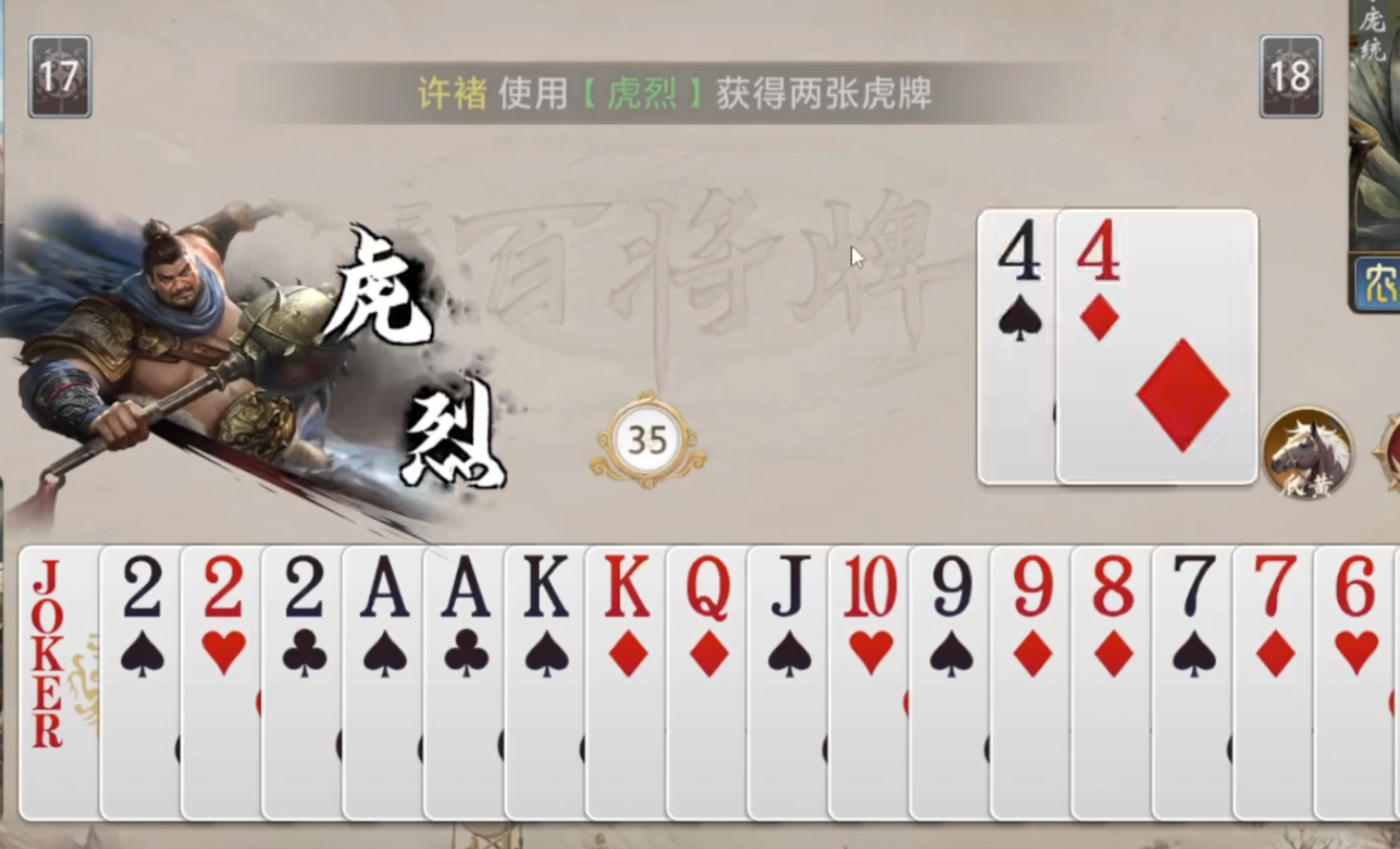 【裸衣】则为关键联动被动技:当你打出“炸弹”牌型(四张相同点数)时,立即重置【虎烈】技能使用次数。需注意,两项技能每次生效后均归零,因此【裸衣】并非单纯增益,而是构建可持续升级循环的核心枢纽——通过合理规划炸弹释放时机,可高频次激活【虎烈】,实现多组【虎牌】的持续生成与动态优化。