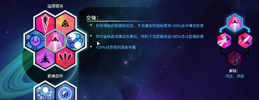 武器模块需搭载诡雷,该装置具备自动感应与区域引爆特性,可对靠近的敌方单位实施无操作触发式打击。构造模块组合包括:超稀有矿业模块“着魔”,支持后续获取的模块进行效果叠加,每完成一次叠加即额外触发1次“着魔”效果;超稀有款爷模块“死亡莲花”,在自身护盾破裂瞬间自动激活;精妙构造模块则直接提升机体建造速度与构造体生成效率。