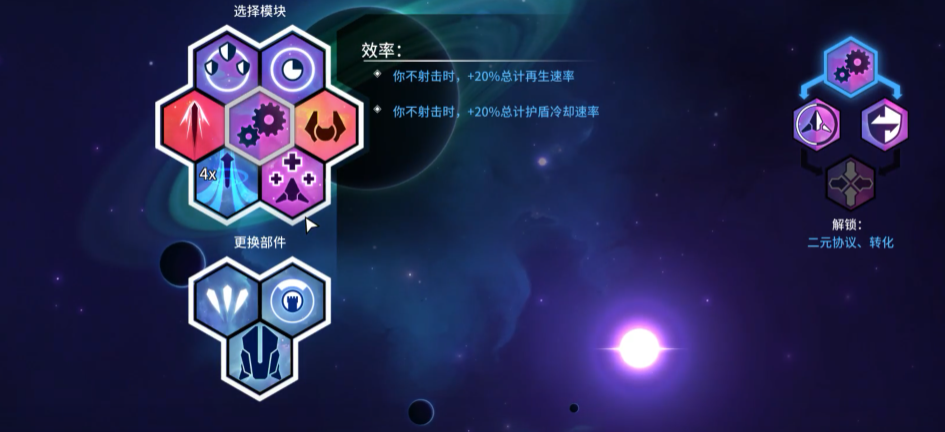 炮台流的基础配置需严格匹配三类核心要素:武器选用焰矛,提供稳定的远程投射能力;护盾类型锁定为反射,实现伤害反弹与战术反制;机体必须采用工程型,确保构造效率与部署容错率。模块方面,优先装配超稀有狂野模块——其核心机制为:非射击状态下,机体再生速率与护盾冷却速率同步提升20%,显著增强续航韧性。