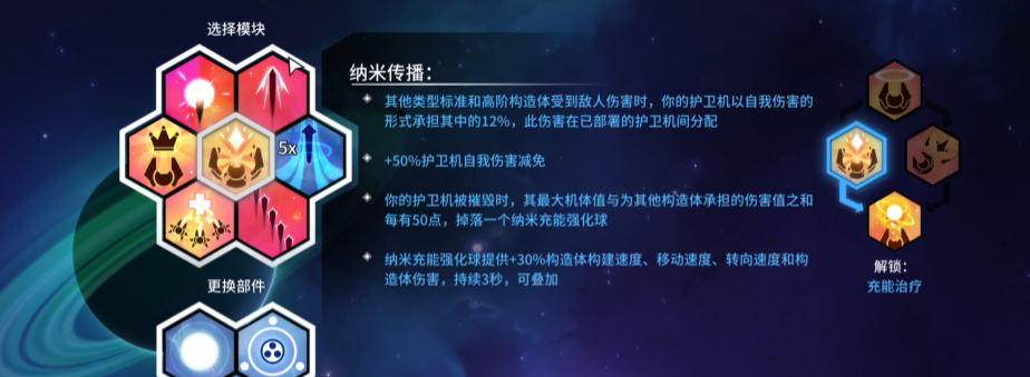 纳米传播模块可使护卫机获得50%的自我伤害减免;当护卫机被摧毁时,其最大机体值与为其他构造体承担的伤害值之和,每达50点即掉落1个纳米充能强化球。“震荡弹”模块扩展僚机自爆伤害作用范围;“自毁装置”模块则在构造体损毁瞬间释放高强度冲击波,对范围内敌人造成范围伤害。