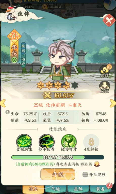 华佗承担团队续航与综合辅助职能。“妙手回春”技能按自身攻击力两倍数值恢复队友生命,保障持久作战能力;“精英奇才”被动则同步强化采集、制造与销售三项基础打工属性。其先天“悬壶济世”气运可在布施药品时概率增加功德获取量;若搭配“灵药宝盆”法宝使用,不仅提升施药效率,更可使最终销售数额提升9%,形成稳定正向反馈闭环。