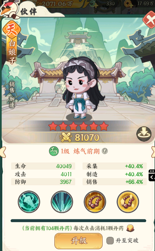 白娘子设定为千年蛇仙,职业定位为“高覆盖率群攻+商业增益型”角色。其主动技能“剑雨临渊”可消耗灵力对范围内全体敌人施加高额伤害,并附带防御削弱效果。当星级提升至18星时,解锁专属被动“销售专家”,显著加快手串售卖节奏;若先天资质为“带货奇才”,则销售速度额外提升50%。进入筑基或元婴境界后,还可通过洗练获取各类后天气运,进一步强化经济循环效率。