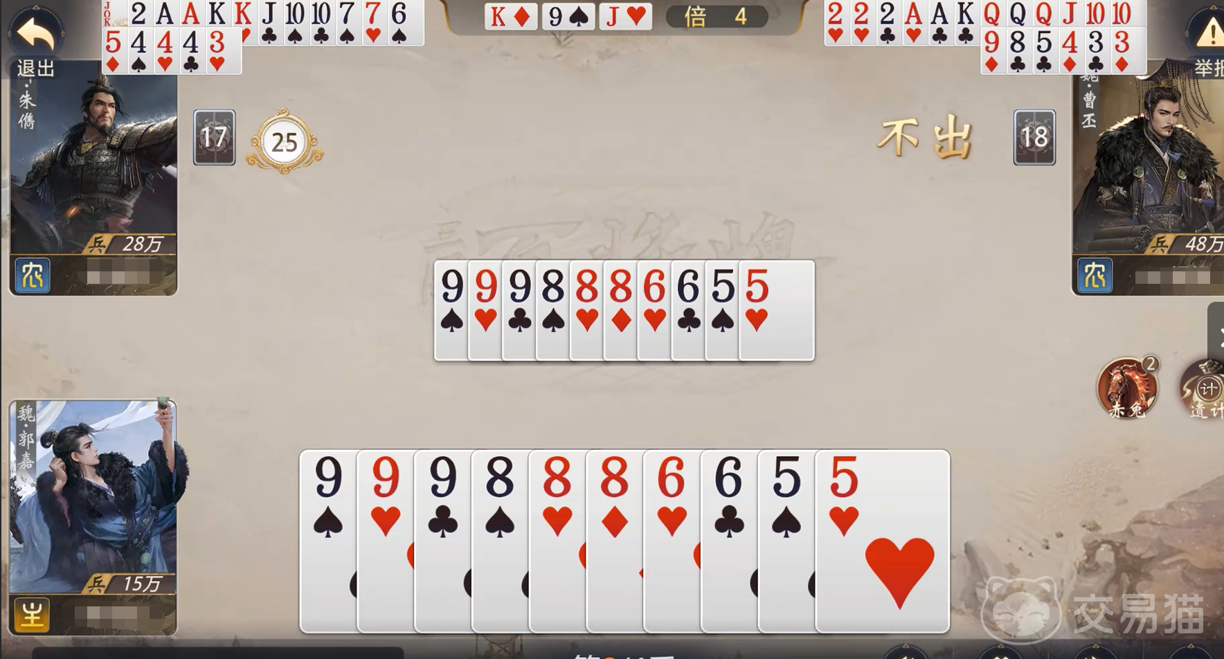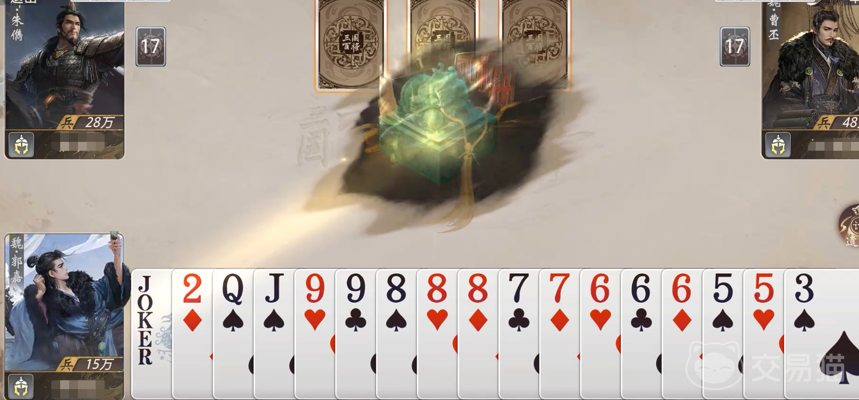 在团队对战场景下,“遗计”的战略价值进一步延伸。若郭嘉处于我方阵营,其技能不仅能完成个人终结,还可通过制造特定牌型(如多组顺子或炸弹)为队友创造无干扰出牌环境;若处于敌方阵营,则需重点关注其手牌数量变化节点——尤其当对手手牌数落入3、4、5、6等易匹配常见牌型张数区间时,应优先保留高权重防御牌,防范其利用“遗计”实现牌型跃迁式翻盘。团队协同的核心,在于共享手牌数量情报与预判技能释放窗口。