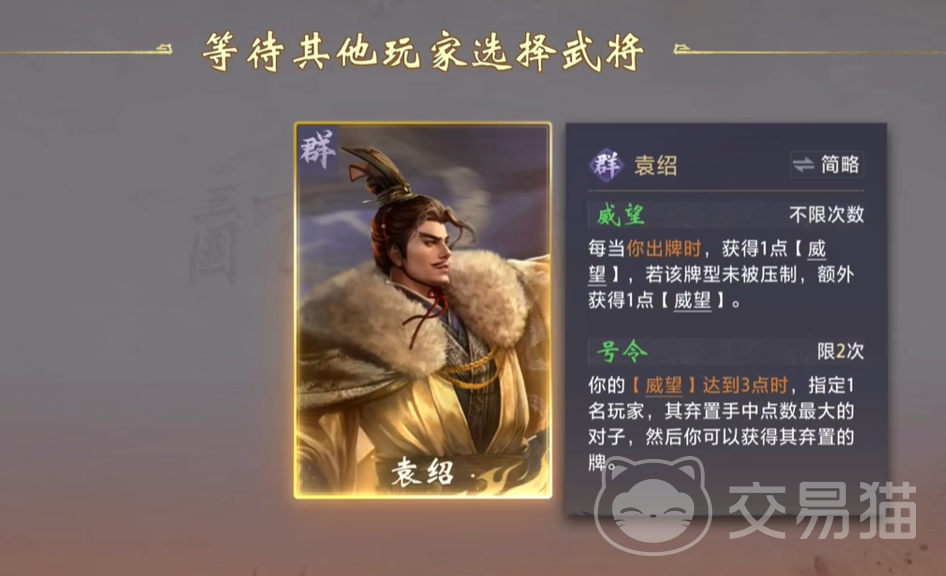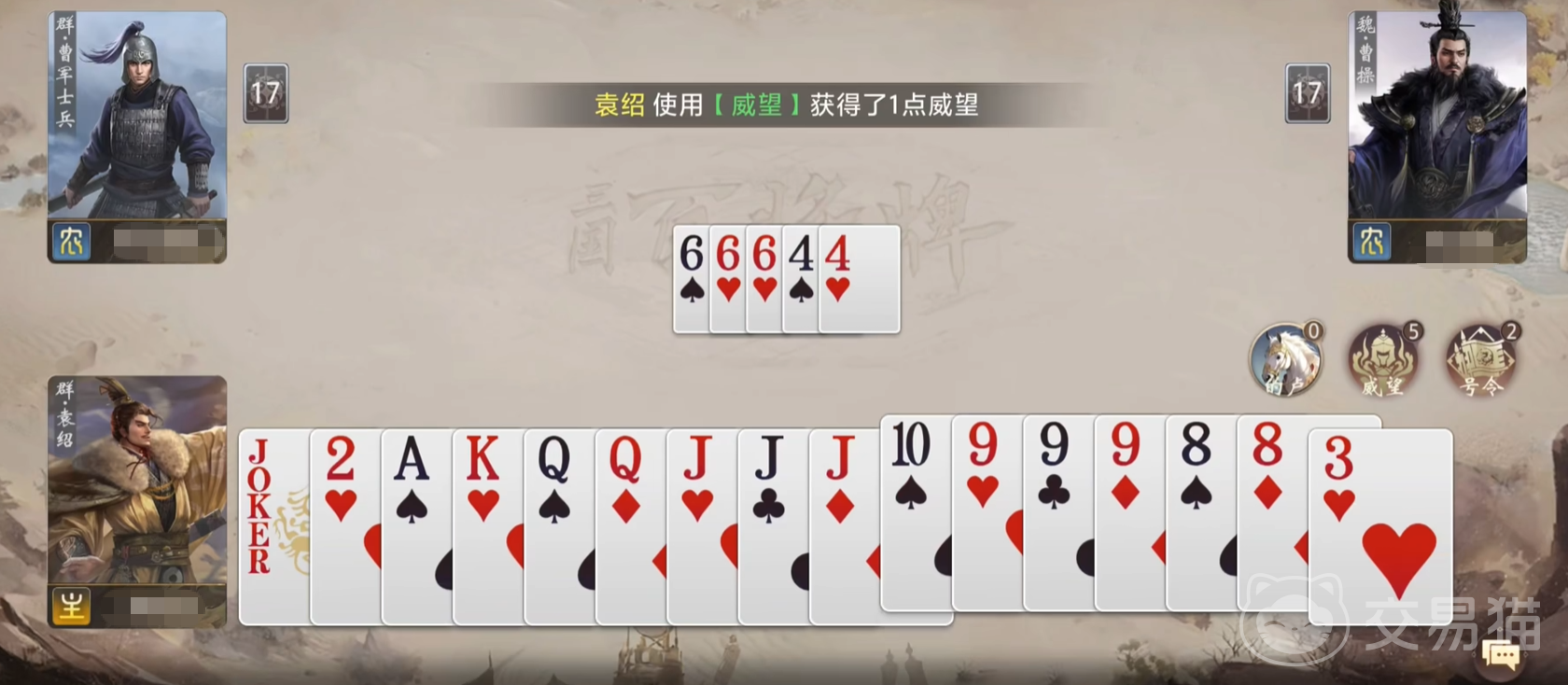 号令技能具有高决策权重与强战术指向性,整局仅可发动两次。当威望累计达3点后,袁绍可指定一名对手,强制其弃置手中点数最大的一对牌,并由袁绍立即获得该对子。该效果既具备破坏性(瓦解对手组合潜力),又具建设性(补强自身关键牌型)。释放时机需综合评估三点:当前威望是否稳固达标、目标对手是否已成型高价值对子、己方后续出牌链是否能承接新获得的牌型。延迟释放或误判目标,均会导致技能效用大幅衰减。