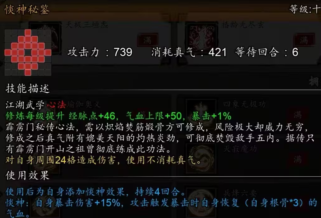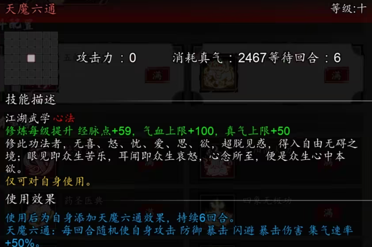 心法层面上,天魔六通需与惔神秘鉴、五恒天经形成稳定协同。惔神秘鉴的关键机制在于暴击后缩减自身冷却时间,该特性与多段判定技能高度契合,可显著提升心法循环频率;叠加五恒天经提供的生命值转化效率与机动性加成后,整套心法体系既能支撑高强度持续输出,又具备应对突发状况的灵活应变能力。二者配合,为后续招式链的无缝衔接提供了坚实的心法底层支持。