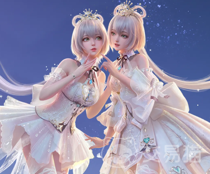 配套发型延续洛天依经典视觉符号——无限形蝶翼环尾造型,发丝呈银白色泽,柔亮顺滑;齐刘海与侧分发线勾勒出清新柔和的面部轮廓;发饰以蝴蝶造型金饰为主,蓝钻镶嵌其间,随光线变化折射微光;头顶配透白薄纱,缀以碎钻与精细暗纹,在不同光照条件下呈现梦幻光泽层次。