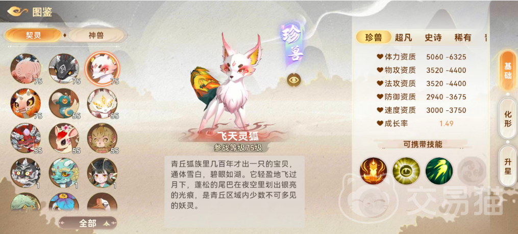 飞天灵狐:定位为功能性辅助契灵。其技能可为1名友方单位提供11%双防(物理防御与法术防御)加成,并赋予1层“祝福”效果。“祝福”具有双重作用:一是当目标受到封印类效果时,自动消耗1层以完全抵消;二是若目标已处于封印状态,则立即消耗1层并解除该负面状态。被动方面,提供270%法术攻击力加成,另有5%额外法术攻击成长空间。