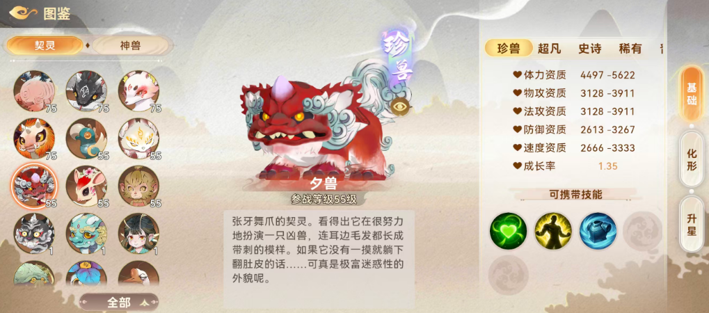 夕兽:专精团队增益的辅助型契灵。技能可为全体友方单位提供双攻(物理与法术攻击力)加成,并提升5%行动速度,该增益效果非固定数值,而是随技能等级提升而延长持续回合数。被动不强化输出,转而侧重生存强化——在提升最大生命值的基础上,额外增加500点固定生命上限,显著提升前排承伤能力与续航稳定性。