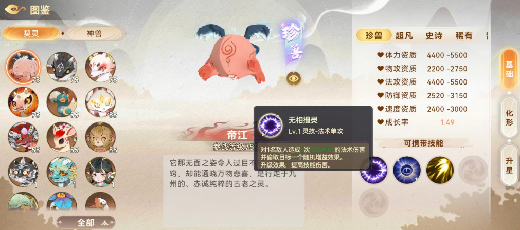 帝江:珍兽品质,主打单体法术压制。其主动技能可对一名敌方单位造成1次基础值为%1的法术伤害,并随机窃取目标1个增益效果。被动“通灵”提供180%法术攻击力加成;另附带法术连击机制,触发概率约10%,最多额外释放1次法术攻击,但每次连击伤害固定降低50%。需注意:多段连击并非线性叠加,实际总伤需结合基础倍率与衰减系数综合评估。