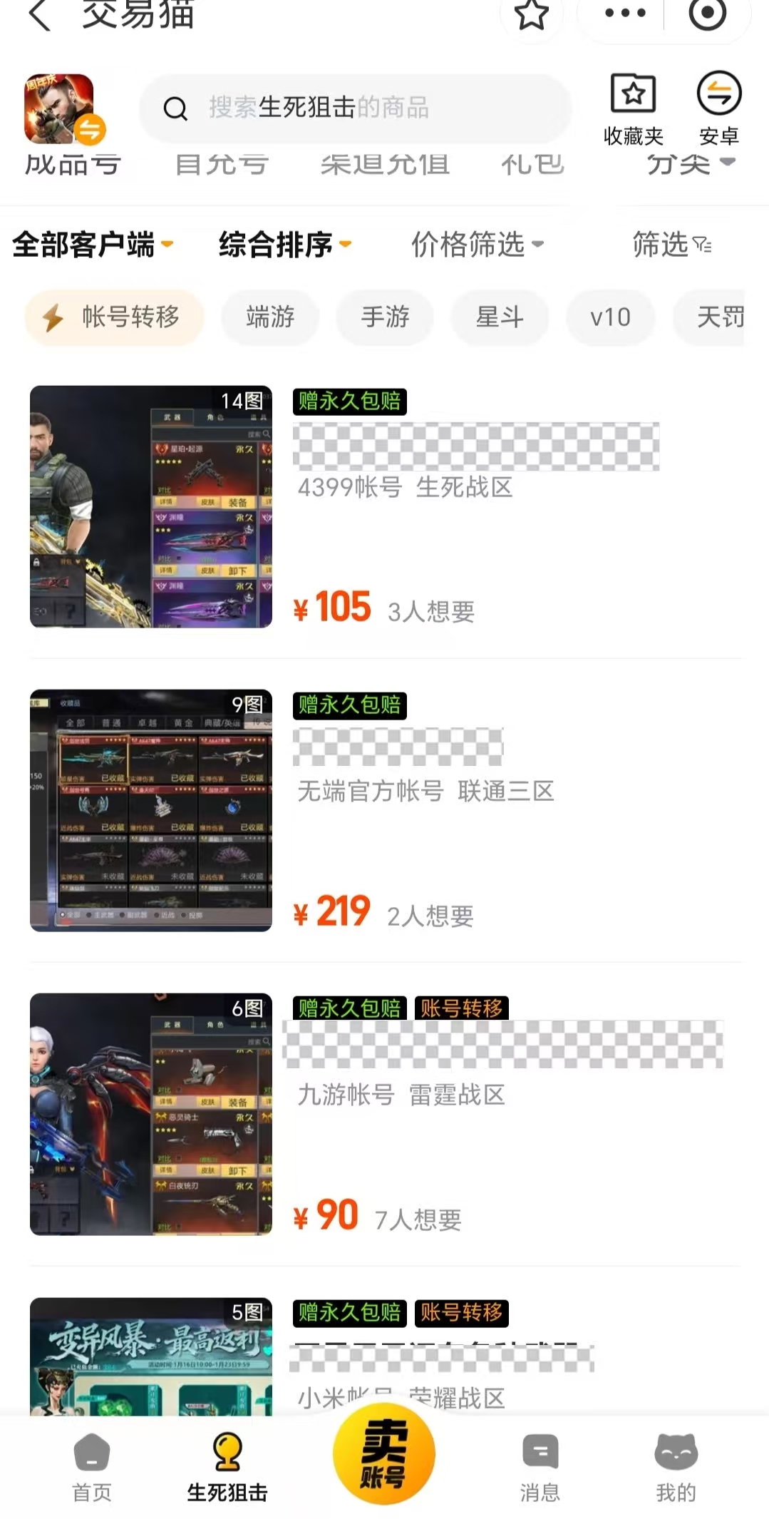 生死狙击自上线以来一直是风靡全网的游戏,更成为不少玩家枪战游戏的最爱。对于新手玩家来说,从零段位开始刷等级、肝武器需要很长时间,上号就满级直接当大佬多爽,这时候他们很想知道生死狙击账号大全哪里能找到,小编建议可以上排名第一的游戏交易平台交易猫。因为这个平台服务响应非常的快,拥有千人优质服务团队,平均0.5h内发货即可完成,平均48h内可完成售后服务。