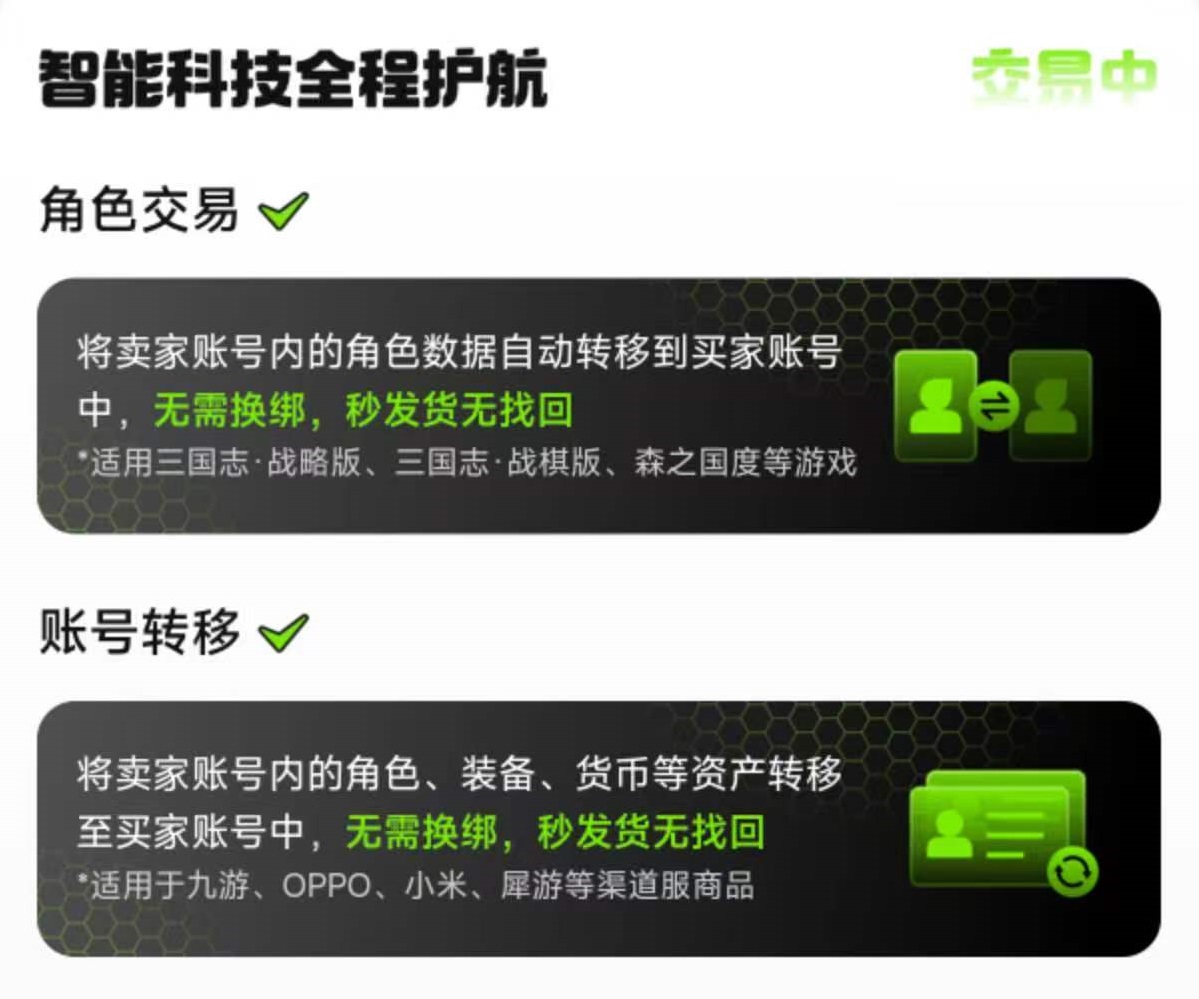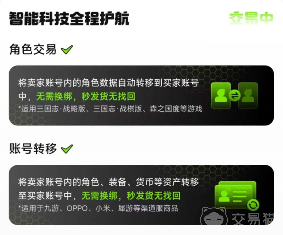 交易猫还有一项非常独特的措施,那就是角色交易和账号转移。如果大家进行的是三国志战略版或三国志战旗版等支持角色交易的游戏,那么可以将账号内的角色自动转移到买家号中。实现了无需换绑秒发货,也不会出现找回,这样对双方来说都是非常安全的措施。卖家也能实现一个账号内的多个角色分开出售,收益会更高。账号转移目前支持九游、OPPO、小米等几个渠道服的商品,可将账号内的角色、装备、货币等资产直接转移过去,同样无需换绑。