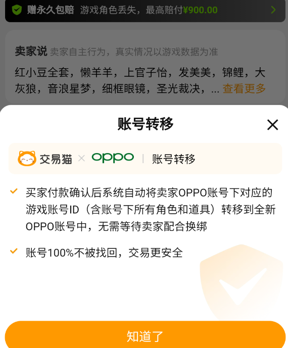 关于账号交付后的长期安全性,交易猫同步支持多渠道账号迁移服务,覆盖九游、OPPO、小米、犀游等主流登录方式。选择标注“账号转移”标签的商品,买家在付款成功后,即可将原账号内的全部角色外观、装备道具及游戏货币,一键迁移至自有目标账号,全程无需密码交接,发货即时,且规避了传统换绑可能引发的找回风险。
