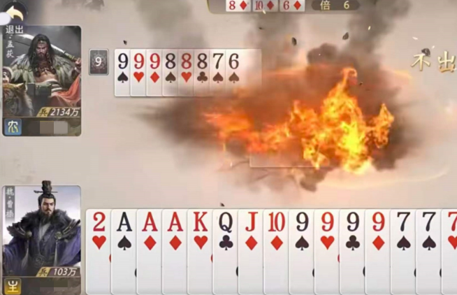 实战中建议采用“诱压—反制—爆发”三阶段打法:开局优先打出小型组合(如三代、连对等低点数牌型),诱导对手使用大牌压制;一旦被压,立即激活枭雄获取对方关键牌;随后利用魏武技能改造新入手的牌,快速整合为三带一(如JJJ9)或顺子,再借势打出连环压制。若手中已存有较大牌组,可先出顺子逼迫对手消耗高位牌,再将回收的大牌与改造后的组件组合成炸弹,完成节奏逆转。