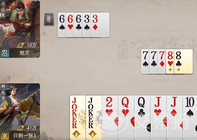 其二技能赋予黄巾牌组“回手再用”的循环特性:当打出含黄巾标识的完整牌组后,该组牌将直接返回手牌。这一设计既缓解了手牌消耗压力,又强化了技能链衔接——尤其在首技能尚未完全铺开时,可通过回手操作二次调度,加速黄巾牌数量积累。所有黄巾牌均以鲜明黄色边框或底纹作为视觉标识,便于玩家实时识别;若其中包含大王牌,则额外激活增益效果,在实战中可显著扩大压制区间与容错空间。