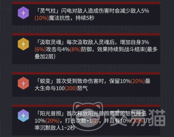 被动技能体系涵盖三层核心机制:灵气柱命中敌人后,可降低目标5%~10%魔法抗性,持续5秒且支持叠加,大幅减轻队伍对减抗辅助的需求;萃取灵魂每次触发提升3%~6%攻击力,最多叠加两层并持续至战斗结束;蜕变机制提供类复活效果,首次承受致命伤害时将保留10%~20%最大生命值,同时反制打出输出;阳光普照则兼具怒气削减与概率沉默效果,在限制敌方节奏的同时维持自身输出节奏。