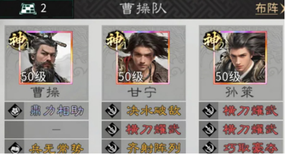 该阵容以曹操、孙策、甘宁为核心三角,三者属性互补、机制协同:曹操提供全局减伤与敌方状态干扰能力,孙策承担范围压制与行动限制职能,甘宁则专注单点穿透与连击追伤。三人组合后,在生存韧性、输出节奏与战场控制三个维度均达到较高平衡,既可稳固前排承伤,亦能快速瓦解敌方关键单位。