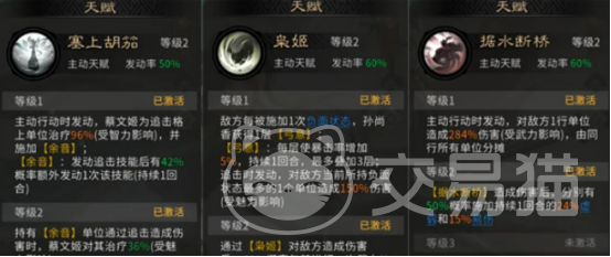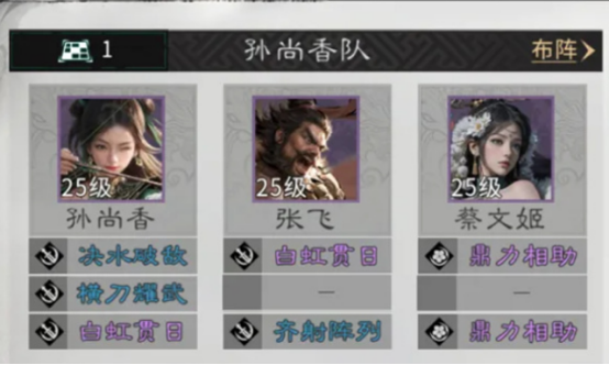 角色天赋深度协同是该阵容的关键优势。蔡文姬天赋【塞上胡笳】可在队友受击时自动施放持续治疗,大幅提升队伍容错率;张飞天赋【据水断桥】可对敌方全体造成大范围伤害,并附加15%易伤效果,有效削弱敌方防御体系。二者配合孙尚香的高倍率单体输出,形成“减防—增伤—爆破”的标准输出循环。