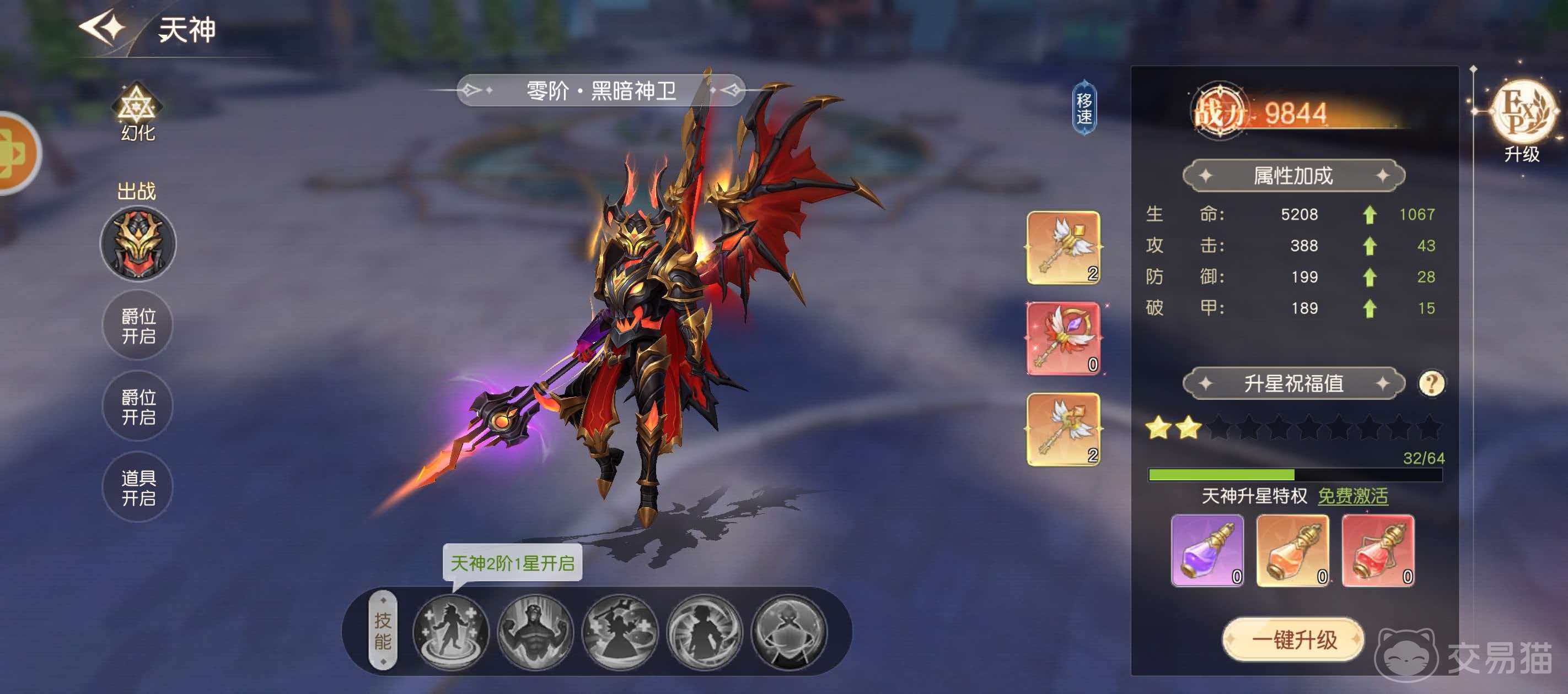 玩家需达成角色等级67级,并完整通关对应主线任务后,方可解锁“天神系统”。该功能入口位于游戏界面右下角固定位置,点击即可进入专属管理界面。系统开启即默认开放首个可幻化单位——零阶“黑暗神卫”,后续更多天神形态将随玩家爵位等级逐步解锁。