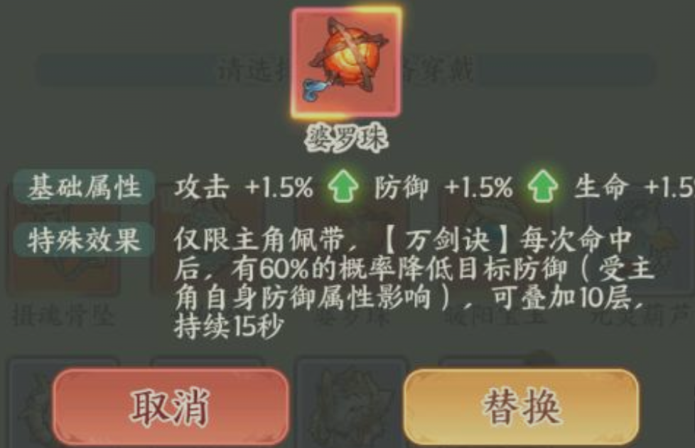 婆罗珠定位为高难度攻坚型法宝,专精于破防压制。其基础属性侧重暴击率与穿透效果,配合小凡核心技能“万剑诀”,可显著提升每次剑影命中的触发概率。在面对高防御、高血量的精英BOSS或机制型首领时,婆罗珠能有效缩短战斗时间,强化输出链稳定性,是搭配物理系或高频率攻击职业的理想选择。