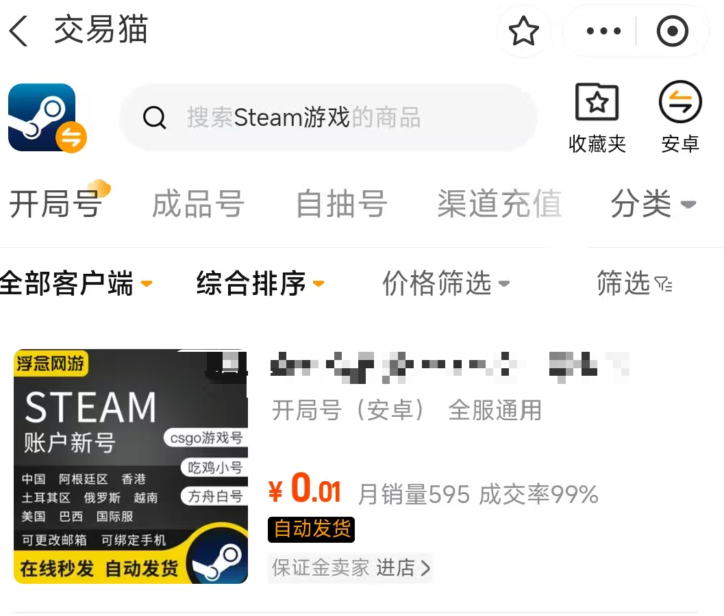 steam账号在交易猫基本上都是开局号,这类账号的定价方面还是比较便宜的,基本上满足玩家们的需求,而且后续交易的时候会有专业的客服进行二次查验,确保玩家们在购买以后就能正常使用了,如果后续出现任何丢失或者被盗的情况,官方都会进行全额的赔付,同时交易猫精选优质真货,拒绝套路与坑骗,交易猫以官方验号为核心壁垒,守护交易安全。超100款热门游戏均可享受真实、完整、准确的验号数据,针对不同设备用户,平台提供最优体验方案,安卓用户点击上方按钮下载,iOS用户前往官网即可轻松使用。