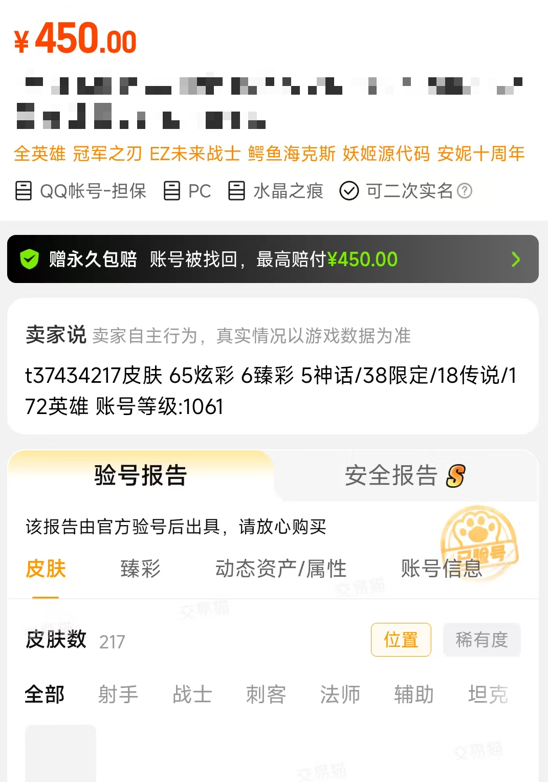 英雄联盟账号内比较有价值的东西基本上都是绝版的限定皮肤,也是很多玩家愿意购买的,但是在购买的时候,玩家们都会怀疑账号的真实性,因为一旦是假的就会损失很多的金钱,而这类问题在交易猫是不会出现的,因为平台内的审核非常严格,而且多数账号都会附上官方验号的标志,确定账号内是真实准确的,并且还额外赠送安心购的服务权益,要是账号后续有任何问题的话,官方都会进行全额赔付的,而且交易猫严选全网优质商品,坚决杜绝虚假信息,平台已实现官方验号服务全覆盖,支持超100款热门游戏,每一份账号信息都经过多重核验,确保真实、完整且准确。安卓用户可直接点击上方按钮一键下载,iOS用户则能通过交易猫官网便捷使用哦。