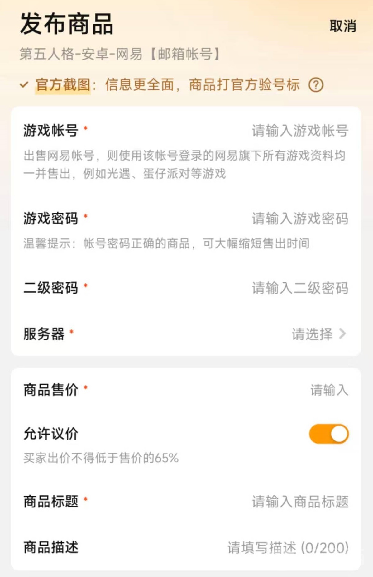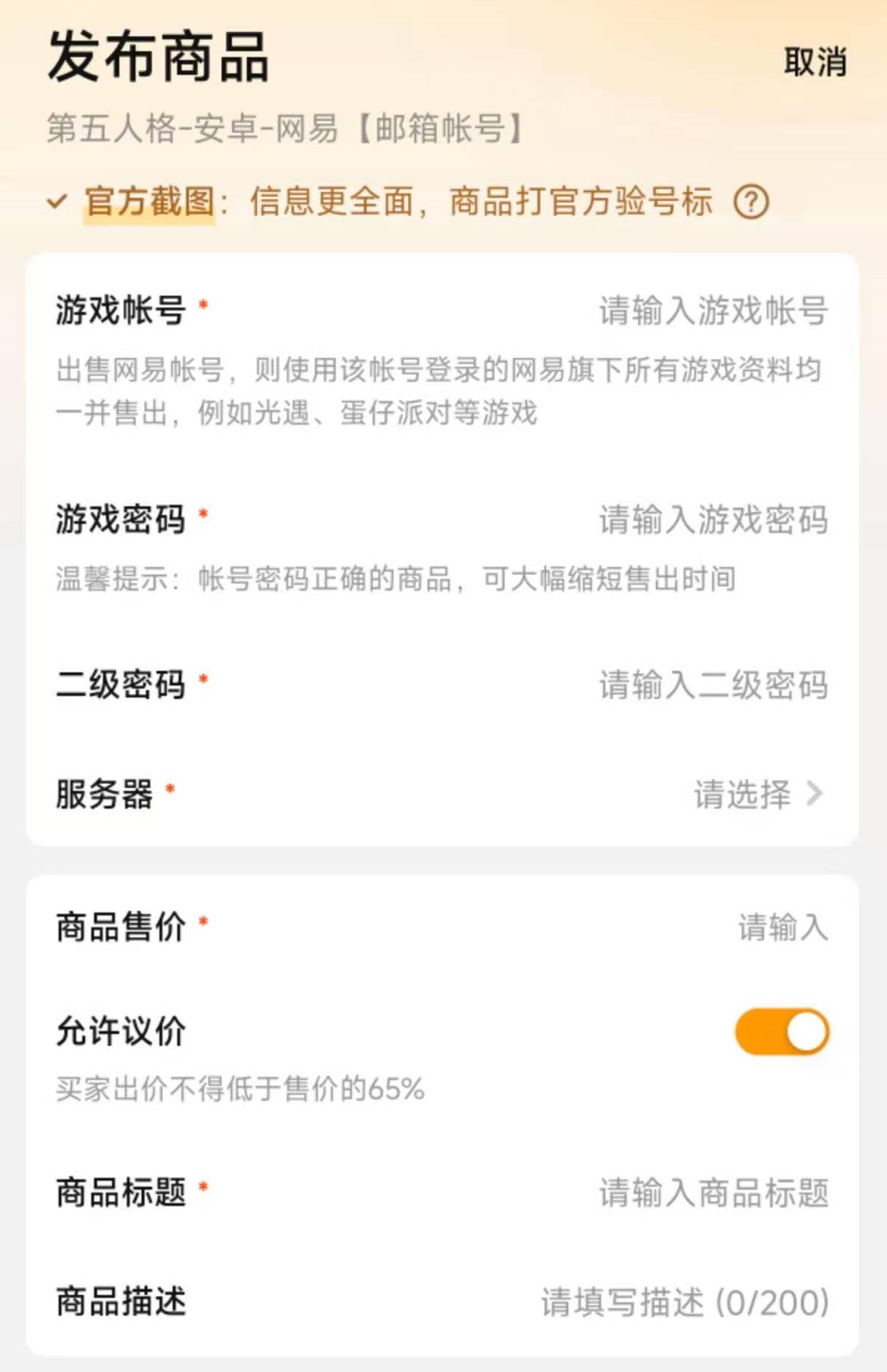 现在第五人格这款游戏已经加入进了交易猫的游戏估值服务中,可以直接通过这项服务对自己的账号进行准确的估值,即使是第一次进行操作,也不会因为价格方面的问题而出现损失或者是影响销售。建议大家选择登录估值的方式,只要提供账号密码,很快就可以得到准确售价,而且全程都有专门的保密措施,不会出现信息泄露。在上架的时候,这款游戏享受官方截图的服务,有交易猫官方上号帮助进行截图发布,省心省力,还会带有验号标签,获得更多的流量,卖得更快。