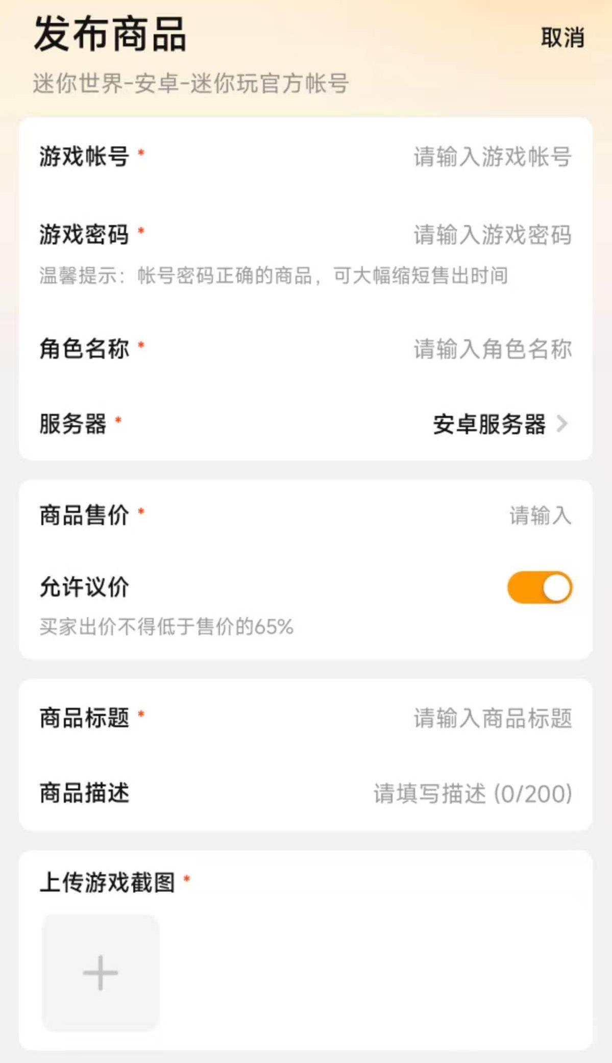 游戏在出售的时候发布也非常简单,只需要简单填写账号密码、名称以及售价和是否允许议价等,这样就能直接上架出售了。注意要认真填写当前的职业、VIP等级,这些都是和价值都有关联的部分,方便买家在选择的时候快速进行挑选。这款游戏的部分渠道服例如OPPO账号,就支持进行账号转移,这是现在最安全的交易方式。直接将账号下对应的角色账号ID包括各种道具,全部转移到新的账号中,不需要等待配合解绑,可确保100%不被找回。卖家也能实现一个账号多个角色出售。
