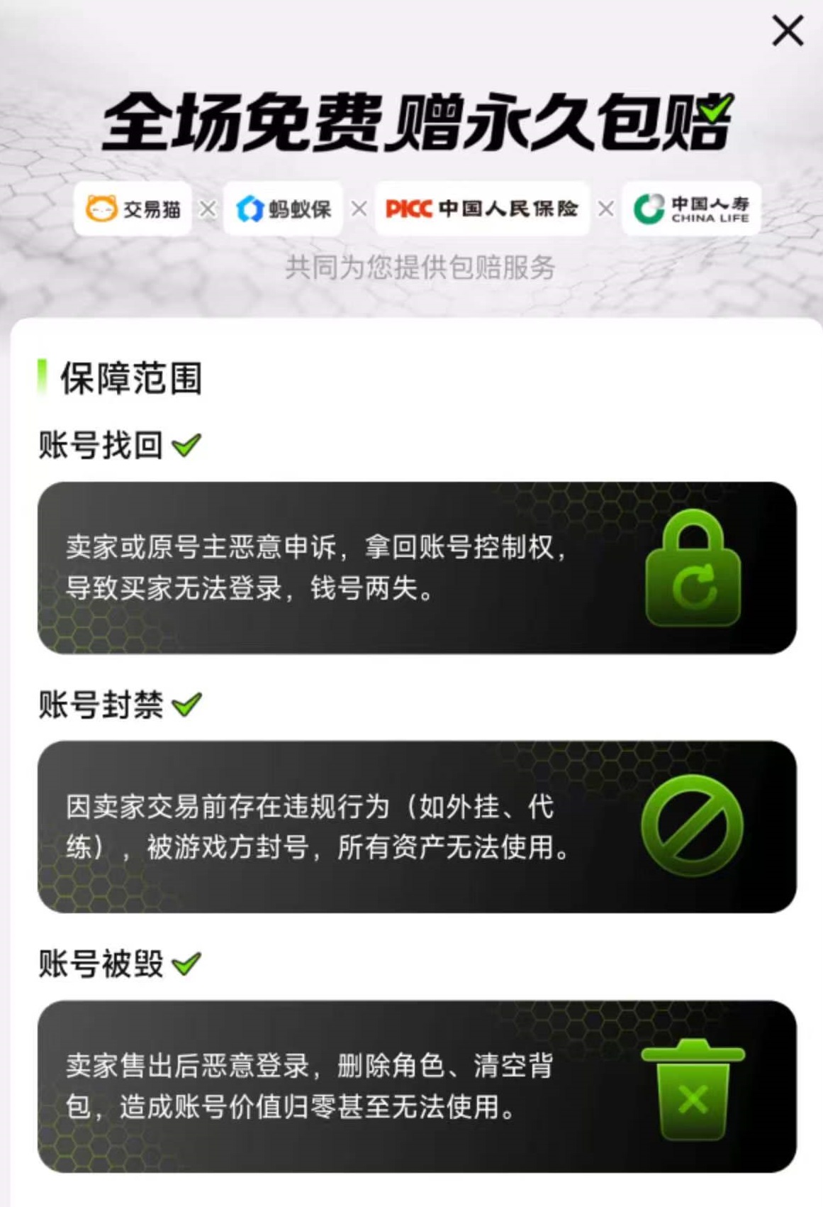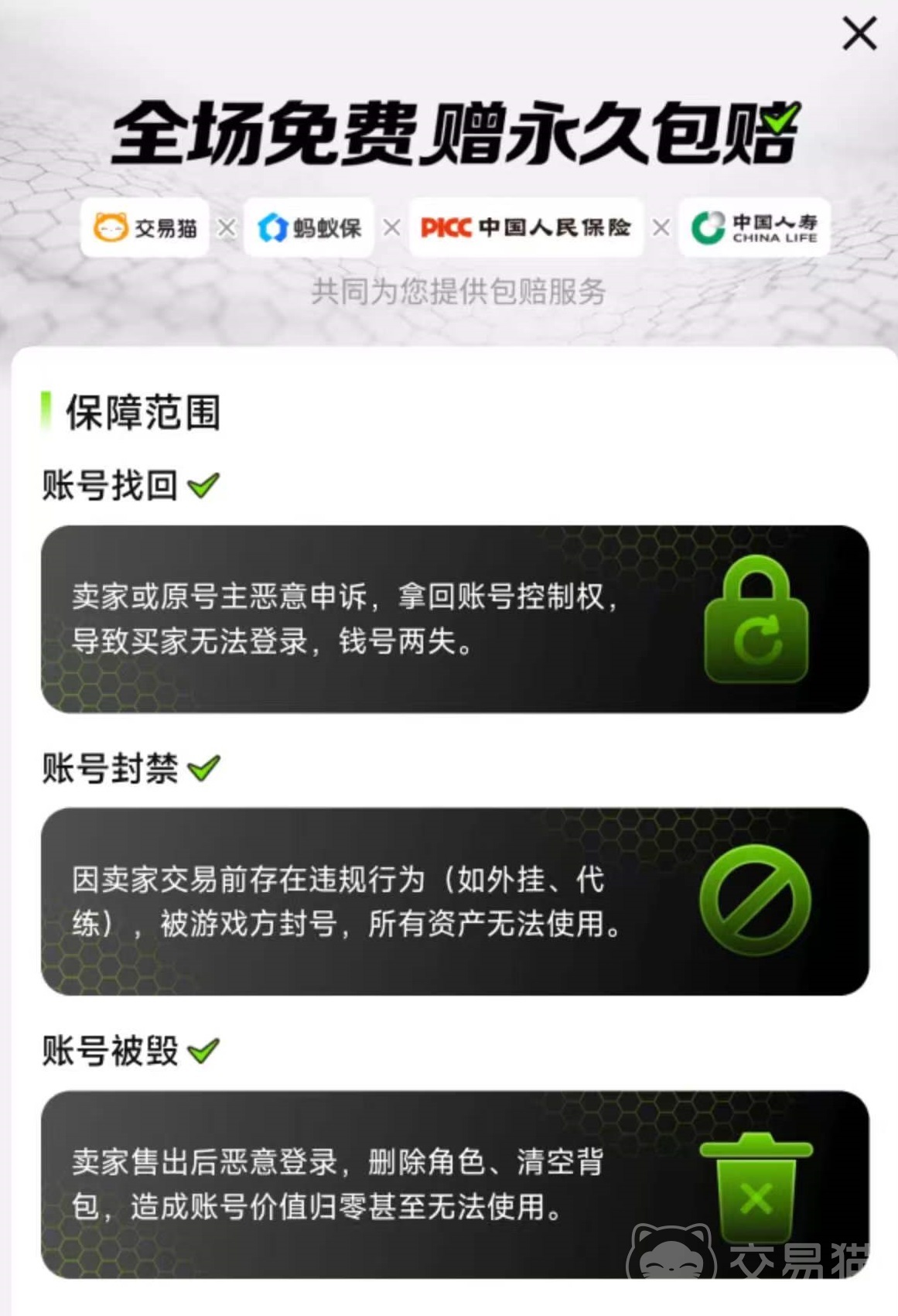 这里的所有成品号都覆盖了永久包赔,目的就是为了防止卖家或者是原号主恶意申诉拿回账号,或者是因为卖家违规行为导致封号。如果是因为这些原因导致的问题,平台就会直接进行赔偿,这样买家购买起来就更放心了。交易猫的服务团队也非常给力,客服保证24小时在线,一旦有问题可以随时联系,即使账号拿到手之后再发现问题,也能随时联系客服降低损失。