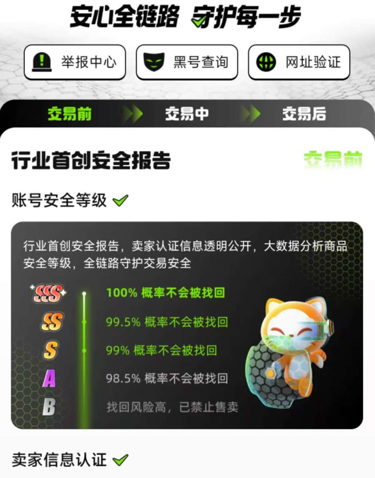 除了永久包赔之外,交易猫还独创了安全链路的保障措施,守护交易过程中的每一步。首先是自身打造了账号安全等级评估报告,每一个上架的账号,卖家认证信息都是透明公开的,通过大数据分析,商品安全等级分为SSS、SS、S等不同分级。大家尽量挑选安全等级比较高的账号进行交易,这样可以更加安全。对卖家信息认证方面也极为严格,包括身份证认证、人脸认证、芝麻信用绑定的,经过平台和第三方权威机构审核,确保每一个用户的身份都是真实可追溯的。这样也相当于净化了交易环境。