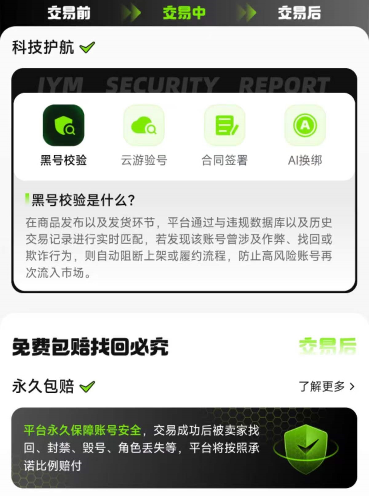 交易猫还积极进行科技护航,开发了包括黑号校验、云游验号、AI换绑等一系列先进科技。平台会通过与违规数据库和历史交易记录进行匹配,看账号是否从涉嫌作弊找回或者是欺诈行为,防止一些高风险的号再次回流到市场中。在验号环节可远程登录实时查看角色装备充值等信息,确保账号真实性和价值。再加上利用智能系统引导账号完成换绑,减少操作失误所导致的风险。